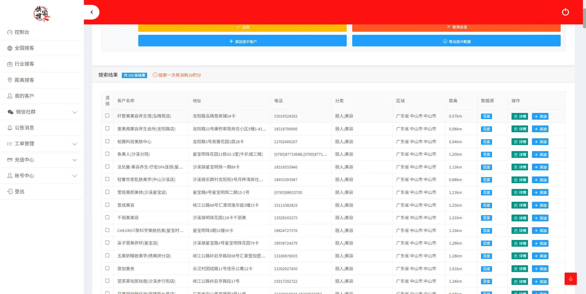 打开「距离搜客」功能,基于你的位置自动展示周边1-5公里内的目标客户,还能看企业“成立时间”“注册资本”“经营状态”——优先选“成立1年内+注册资本100万以上”的高潜力客户,地推效率直接翻倍。 -